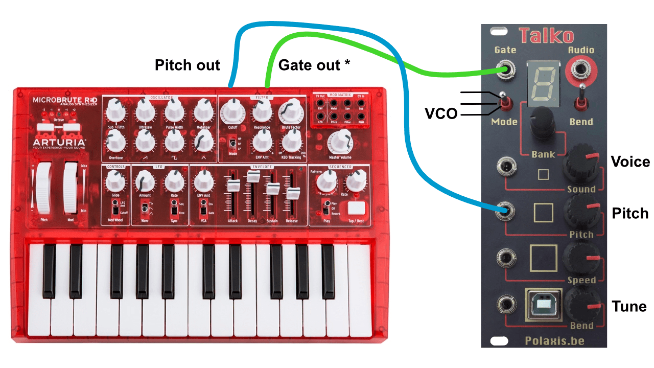 (*) Please note that the Microbrute’s gate out can’t trigger Talko directly (it’s a Microbrute know impedance issue): use a gate buffer in between.