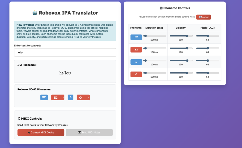 This tool helps sequence text into phonemes, while also allowing duration and pitch adjustment. Test the sequence by connecting the page to Robovox. It also allows you to save the sequence as a MIDI clip.