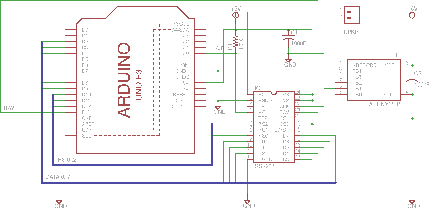 The SSI-263 datasheet is quite easy to find and so the programming guide via some Google search but the best one I found is the Votrax SC-02 version that has an extra page at the end with a nice and very simple schematics to get started with .